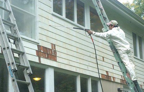 We apply a solution of one part bleach to four parts water. Let stand for 15 minutes to allow solution to dissolve mold and mildew. We pressure wash home with water.